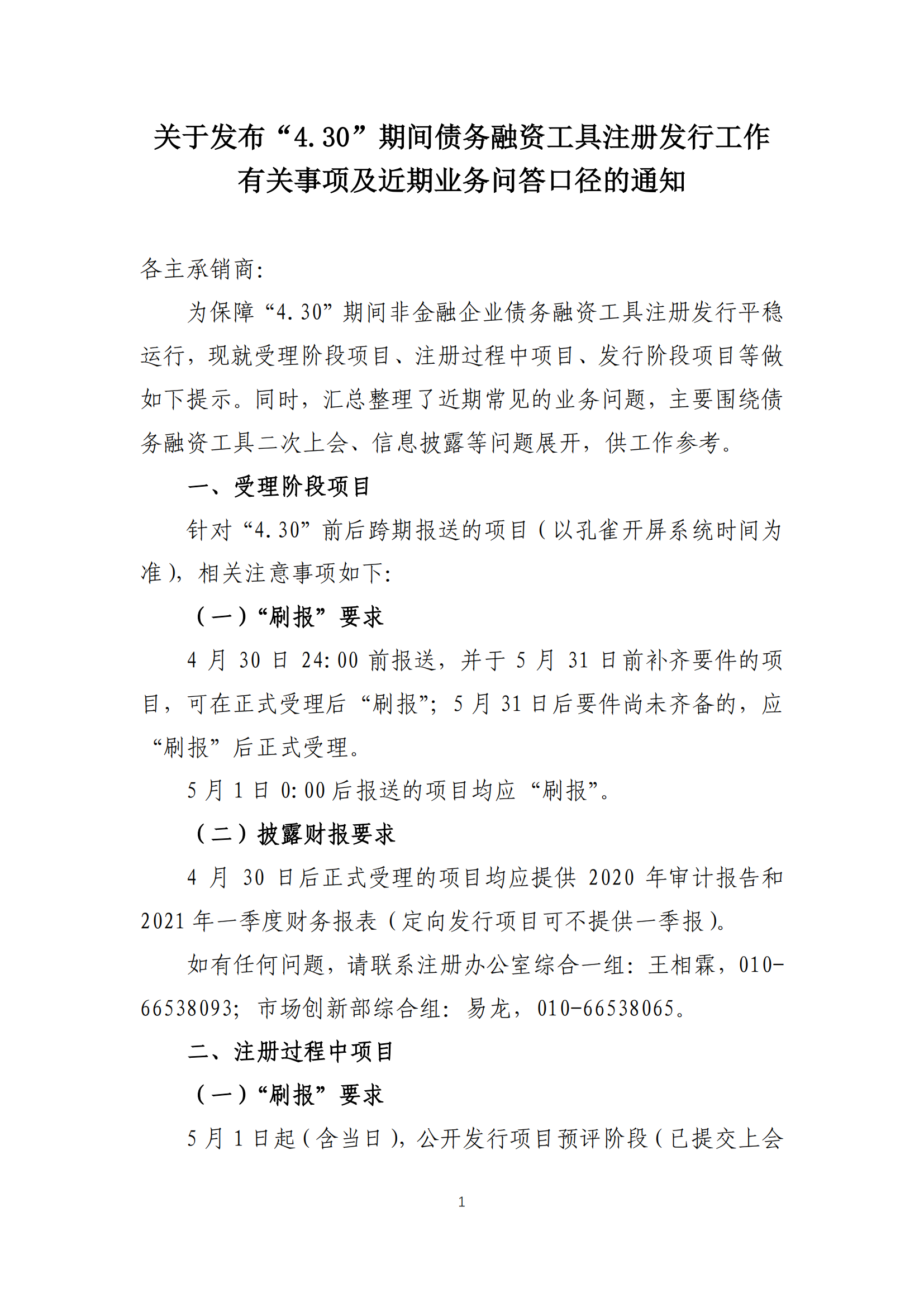 关于发布“4.30”期间债务融资工具注册发行工作 有关事项及近期业务问答口径的通知
